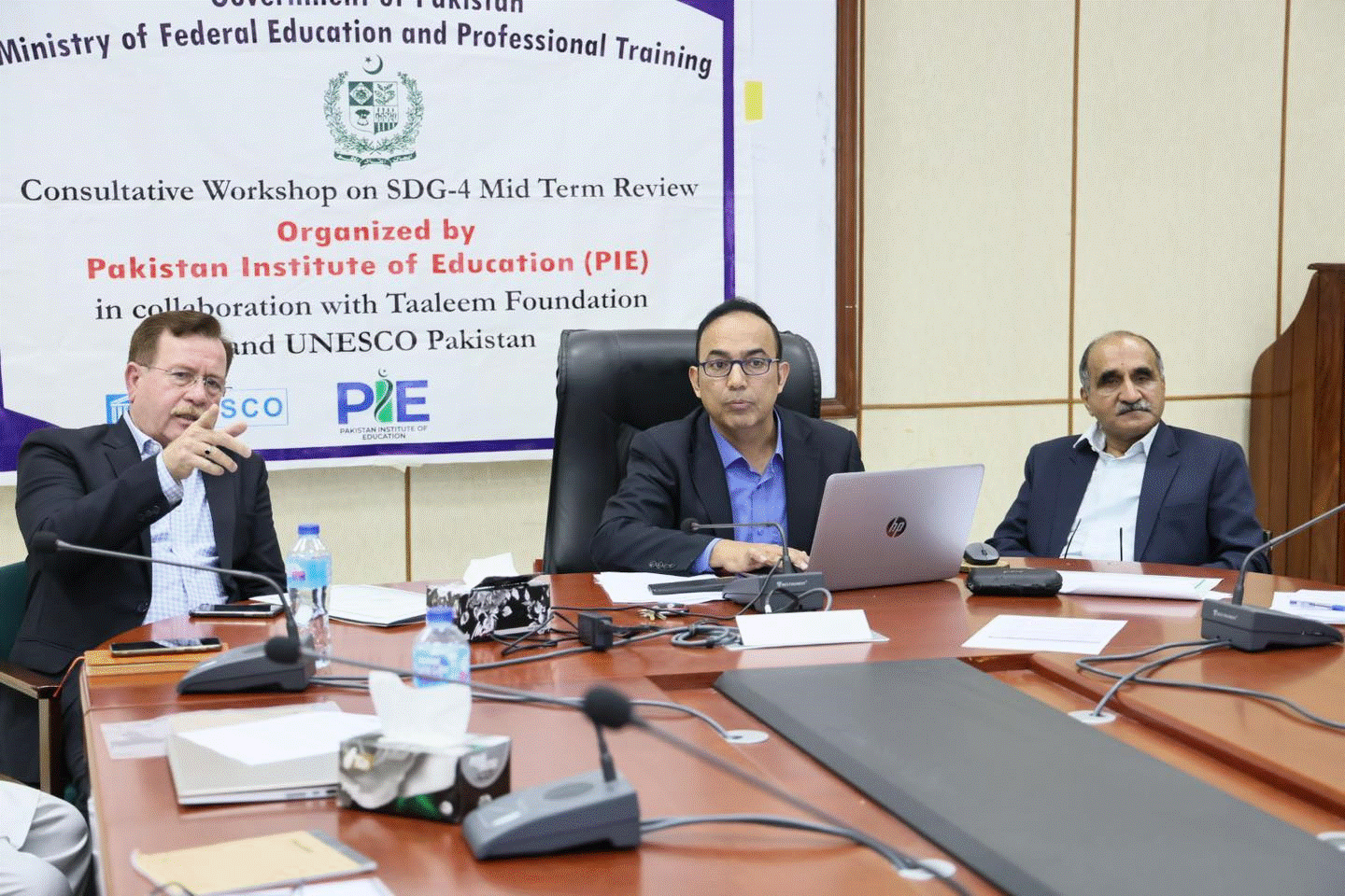 As The Lead Consultant for Taaleem Foundation, Islamabad with the financial support of UNESCO, Pakistan is conducting a Midterm Review (MTR) of Pakistan on SDG-4 from October 2023 to December 2023. The MTR will be developed by the Pakistan Institute of Education (PIE), Ministry of Federal Education under the leadership of Dr. Shahid Soroya, Director General. The 6th Consultative Workshop was held at the Pakistan Institute of Pakistan (PIE) on December 4, 2023, and the last Workshop will be held in Gilgit on 8th December 2023.